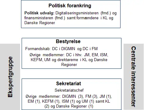 Taskforcen har en bestyrelse bestående af departementschefer fra de i Taskforcen deltagende ministerier samt forpersonerne for KL og Danske Regioner. Taskforcen er politisk forankret med et udvalg bestående af finansministeren (delt formand), digitaliseringsministeren (delt formand) og forpersonerne for KL og Danske Regioner.
